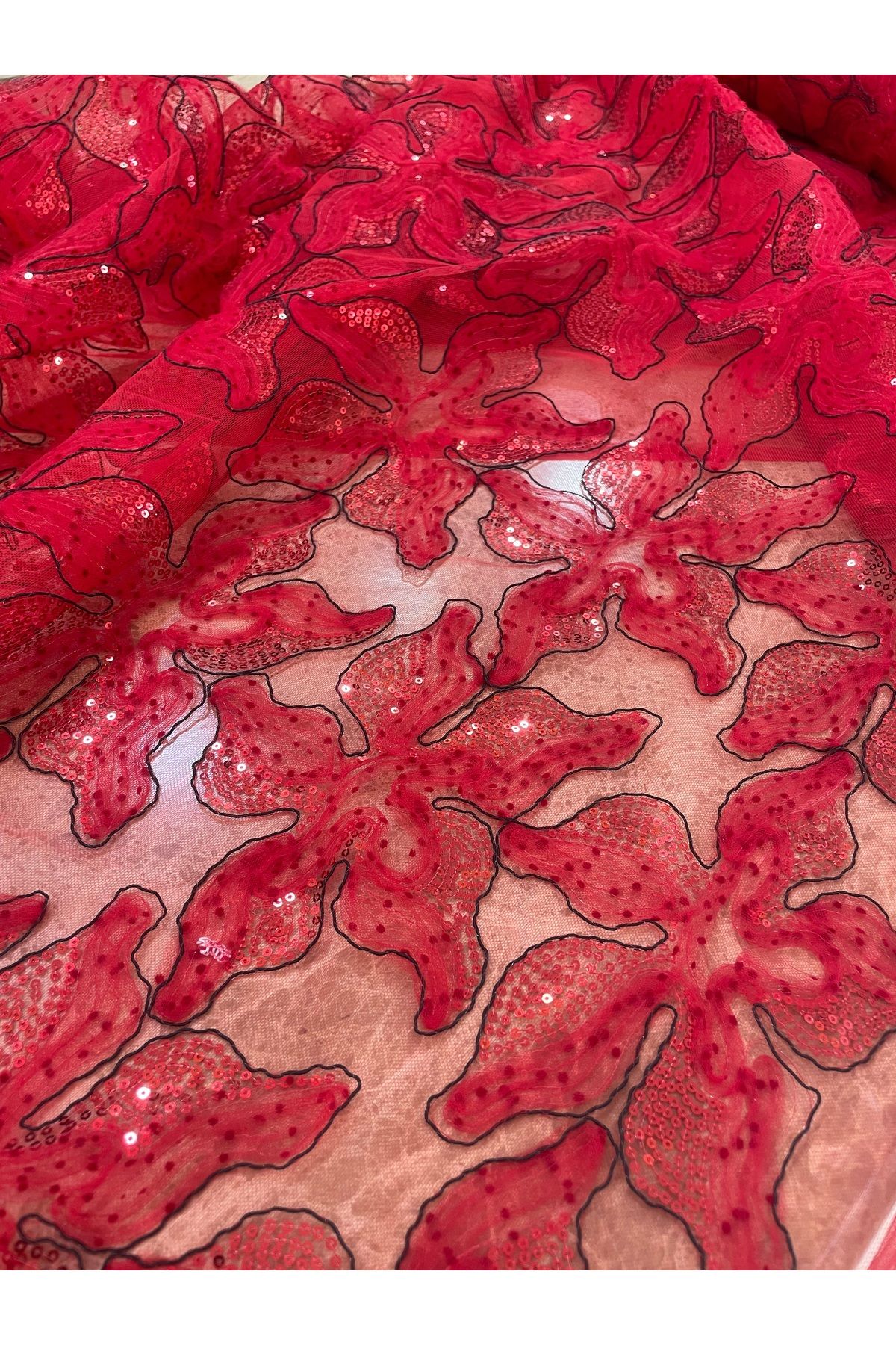 135 cm Eninde Kırmızı Pullu Çiçek Desenli Tül Kumaş | Gösterişli Abiye ve Dekoratif Tasarımlar İçin