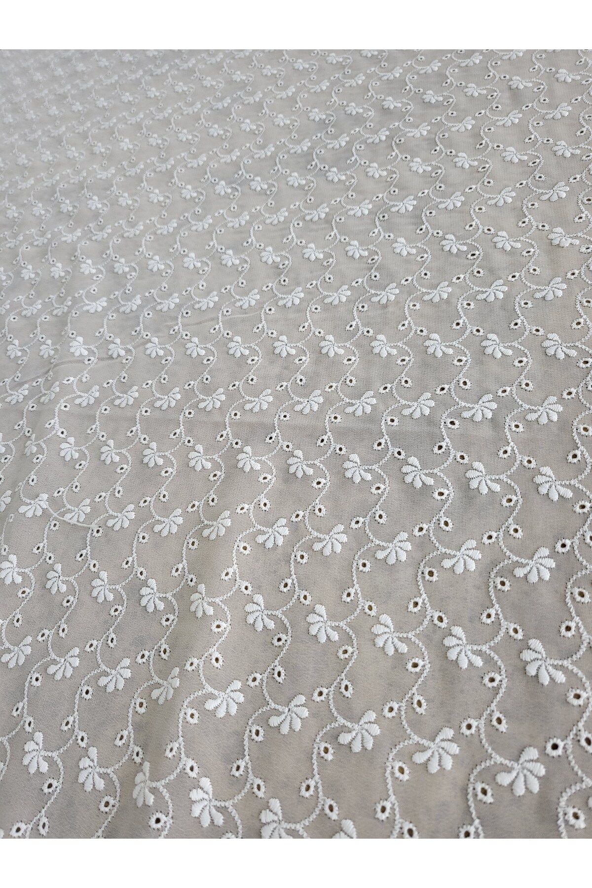 Hafif ve dökümlü yapısıyla şıklığı ön plana çıkaran bu beyaz şifon kumaş, ince zemin üzerine işlenmiş zarif çiçek nakışlarıyla dikkat çeker. 135 cm enindedir ve elbiselik, bluzluk, gömleklik veya fular gibi yazlık kıyafetlerde kullanıma uygundur. Yarı transparan yapısıyla hem klasik hem modern tasarımlara uygundur. Nefes alabilen yapısı sayesinde yaz aylarında tercih edilir. Metre ile satışa sunulmaktadır.